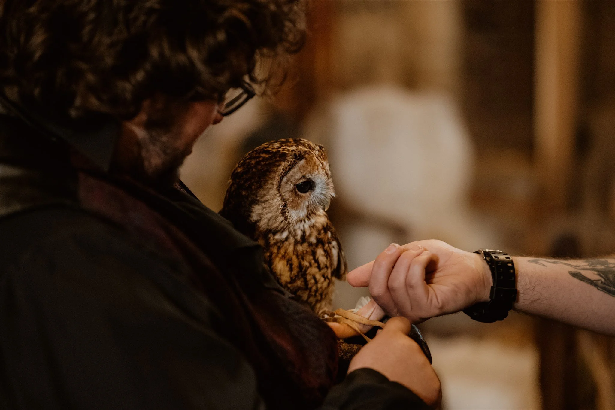 Inside the ancient stone church of Dode, the couple exchanged vows in a legal ceremony led by A Kentish Ceremony — made unforgettable by a ring delivery from a majestic owl, courtesy of Kent Owl Academy. Afterwards, they stepped outside for a deeply personal handfasting ceremony with celebrant Paul, binding their lives together in a ritual that felt ancient, earthy, and entirely their own.